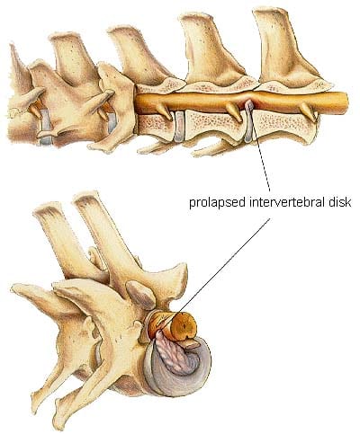 Disc herniation results in varying degrees of pain and neurologic deficits depending on the site of disc herniation, degree of spinal cord compression, and amount of concussive injury or bruising to the spinal cord. Common signs may include reluctance to move or jump, holding the nose pointed to the ground (common in neck injuries), holding the head arched backwards (common in back injuries), screaming or crying when touched or picked up, trembling, an ataxic (wobbly or uncoordinated) gait, and dragging one or more legs (often both back legs).
