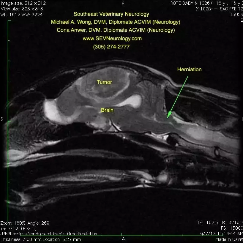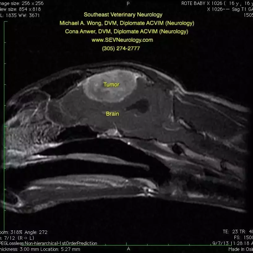 Blood tests including a CBC, chemistry panel, T4, and urinalysis were unremarkable. Thoracic and abdominal radiographs were unremarkable. Magnetic resonance imaging (MRI) was performed.